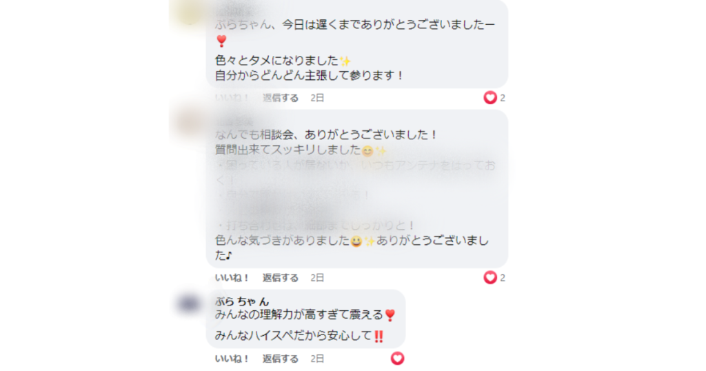 (相談会参加者さんから嬉しい感想も届いています。みんな落とし込んでいて、すごい!)